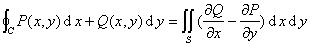 1°曲线积分与二重积分的关系.设C为逐段光滑的简单(无自交点)闭曲线,围成单连通的有界区域S,这围线的方向使区域S保持在左边,若函数P(x,y),Q(x,y)及它们的一阶偏导数在S+C上连续,则有格林公式 :