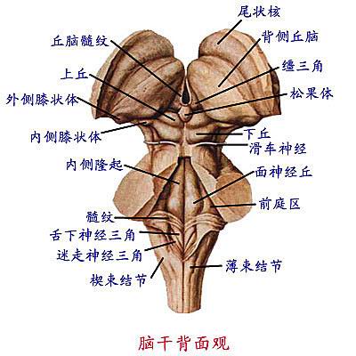 (3)中脑:有四叠体,即两个上丘和两个下丘。上丘与视觉反射有关,下丘与听觉反射有关。