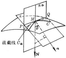 [任意平截线的曲率半径]  用通过点M的任意平面截曲面得截线C(图),它在点M的切线为PQ,曲线C的法线单位矢量为n,通过直线PQ和曲面的法线单位矢量N作意平面,截曲面得法截线。若矢量Nn夹角为,而的曲率半径为,则截线C的曲率半径为
