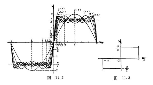 [ Gibbs phenomenon ]  that a periodic function has a discontinuous point of the first kind , let , the jump of the function at a point is The Fourier series of the partial sum is s m ( x ). Then the Fourier series of the function converges at the point, but does not converge in the neighborhood . A strange phenomenon ( called the Gibbs phenomenon ) occurs at this time :